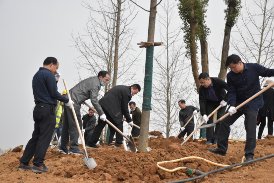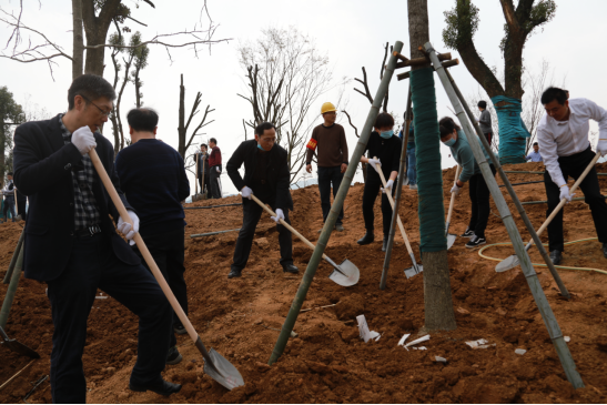 上午10点,植树队伍积极投入到植树活动中,大家纷纷拿起铁锹、铲土入坑、培实新土,将一棵棵枫香树和樟树种下,活动现场一派热火朝天的景象。大家一边劳动,一边欣赏和谈论新校区的美景和建设情况,脸上绽放出幸福的笑容。一会工夫,八里坡上树木迎风挺立,在阳光的照射下生机勃勃。