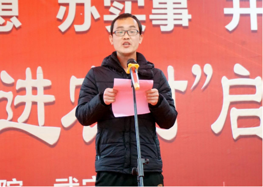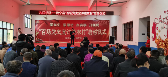 启动仪式上,武宁县委常委、宣传部部长刘斌向马克思主义学院10名博士教授颁发了宣讲员聘书,马克思主义学院院长陈胜才宣读了《百场党史宣讲进农村活动方案》,宣讲团成员代表马克思主义学院周春芸博士作了表态性发言。