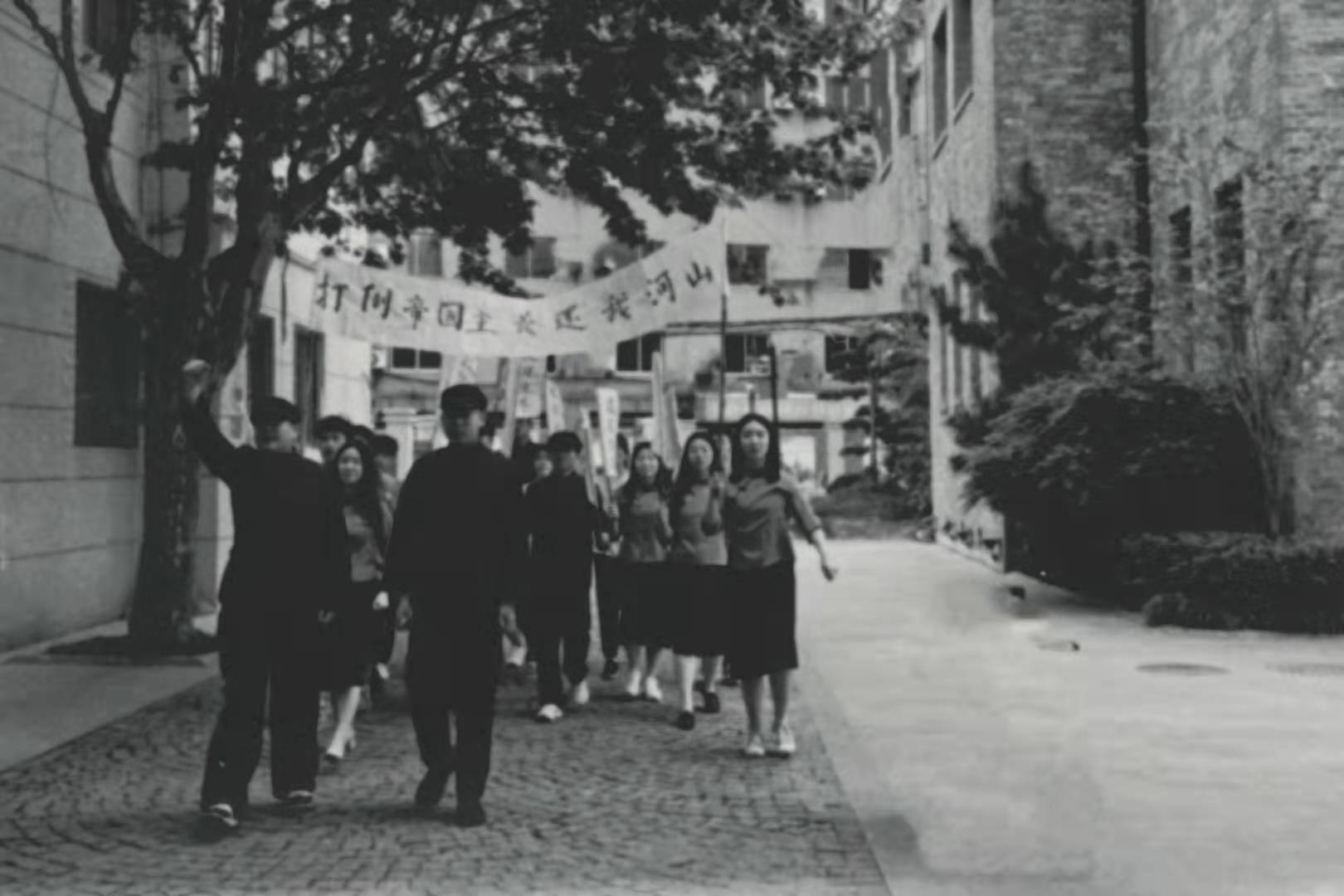 情景再现:大学生在九江租界旧址再现九江人民收回英租界(画面做旧处理)