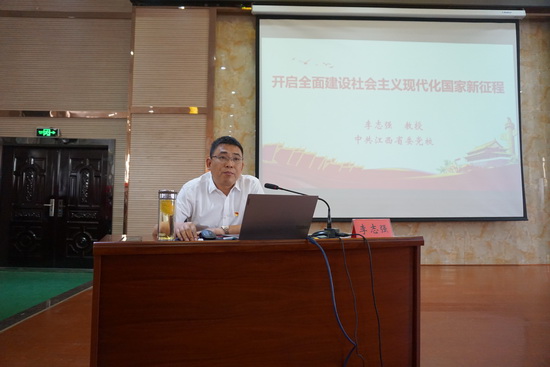 培训班仪式结束后,江西省委党校李志强教授为与会同志作了题为《开启全面建设社会主义现代化国家新征程》的专题辅导。李教授从准确领会十九届五中全会召开的重大意义、准确把握《建议》精神主旨、贯彻落实好十九届五中全会精神的重点任务等三个方面,对党的十九届五中全会精神进行了全面、深入、准确的解读阐释,并结合实际,对学习贯彻全会精神谈了认识体会,集中回答了新形势下实现什么样的发展、如何实现发展等问题,为学校领导干部更好地理解和领会全会精神做了精准指导。