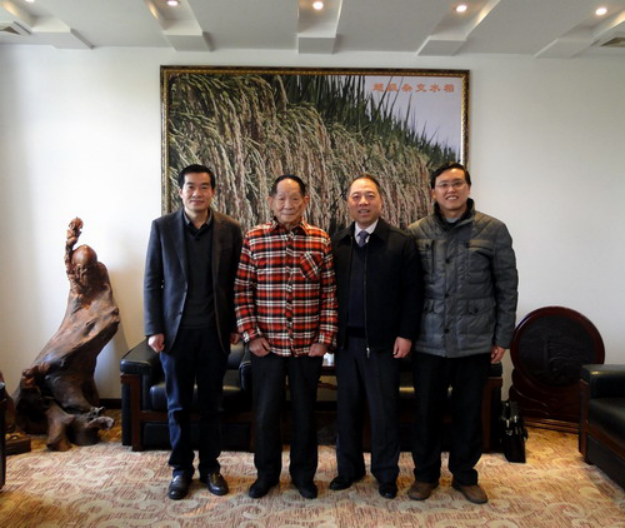 2014年2月21日,我与时任党(校)办主任刘遵海、宣传部干部吴彭年一道,专程赴长沙国家杂交水稻工程技术研究中心,拜访我校名誉教授袁隆平院士。我代表