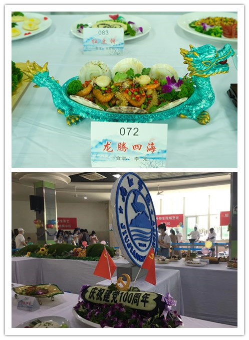 展示区气氛热烈,吸引了众多师生、教职工观摩品尝。参展菜品包含近百道传统菜品和60余道创新菜品,类型多样、形态各异,主食造型雕刻、美味甜点拼盘、菜品创新烹饪,各种美味佳肴琳琅满目。花灯醉、难忘花千骨、节节高、盘龙戏珠、腾飞云霄的龙虾、诗情画意的千层酥、花边状的南瓜灯、锦上添彩的幸福团子……精致的菜品彰显了饮服中心厨师高超的刀工技艺以及食物与艺术相结合的美妙思路,引得大家纷纷合影留念。