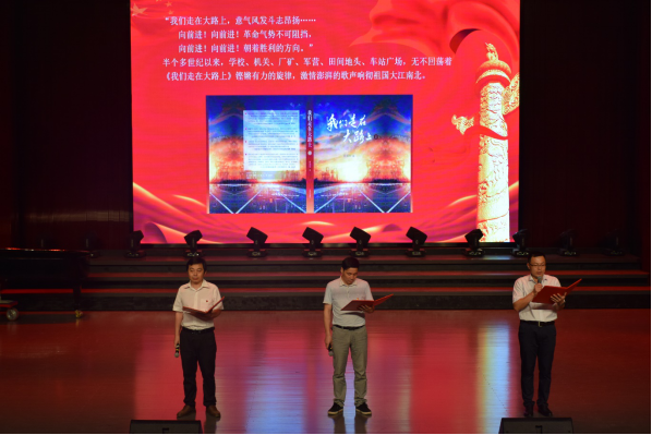 由艺术学院教师党员领唱、两个支部全体党员上台合唱的《我们走在大路上》将主题党日活动推向高潮,铿锵有力的旋律激励着全体党员牢记初心,践行使命,向着实现中华民族伟大复兴的中国梦目标前进。