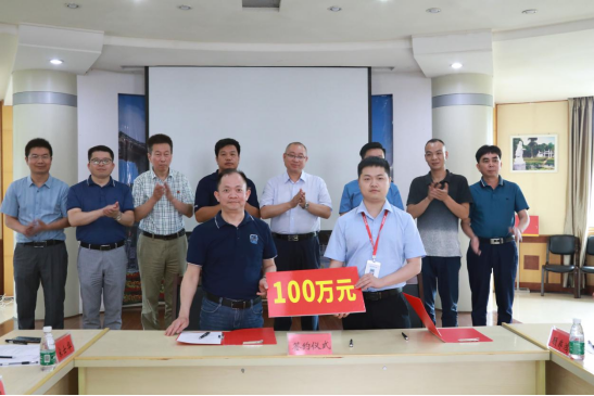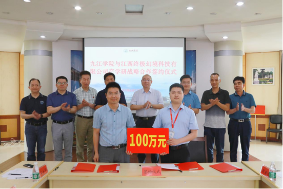 会上,我校与江西终极幻境科技有限公司签订了产学研战略合作协议,江西终极幻境科技有限公司出资100万元委托我校进行创新创业人才协同培养,出资100万元进行