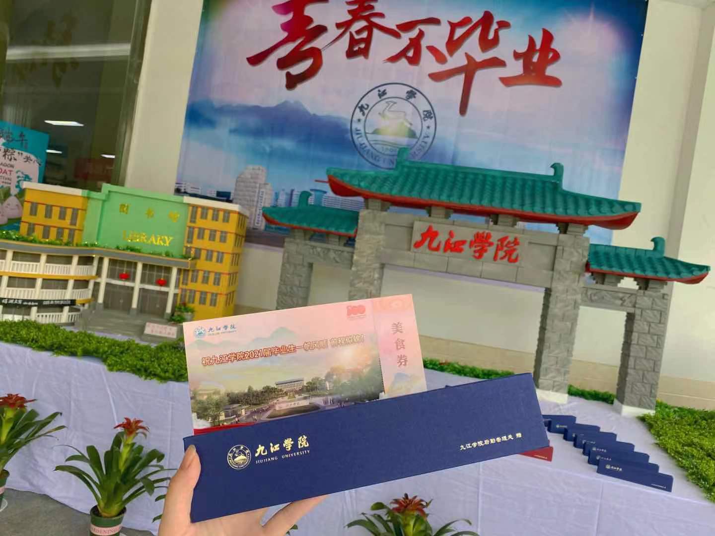 所有毕业生只需要出示校园卡或者学生证,就可以领取一张精美的毕业餐券。餐券画面选用了紫薇园新校区的大门作为背景,温馨的祝福语感动了到场的每一名毕业生,大家纷纷拿着餐券合影。