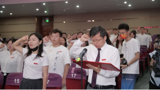 面对国旗,40余名新入职教师高举右手进行庄严的入职宣誓。