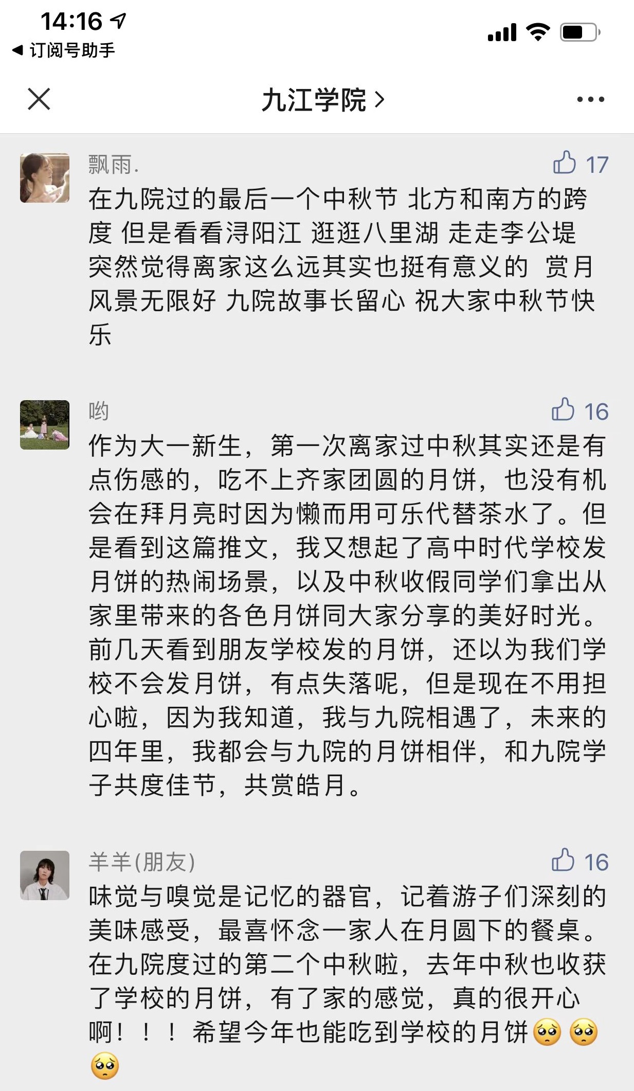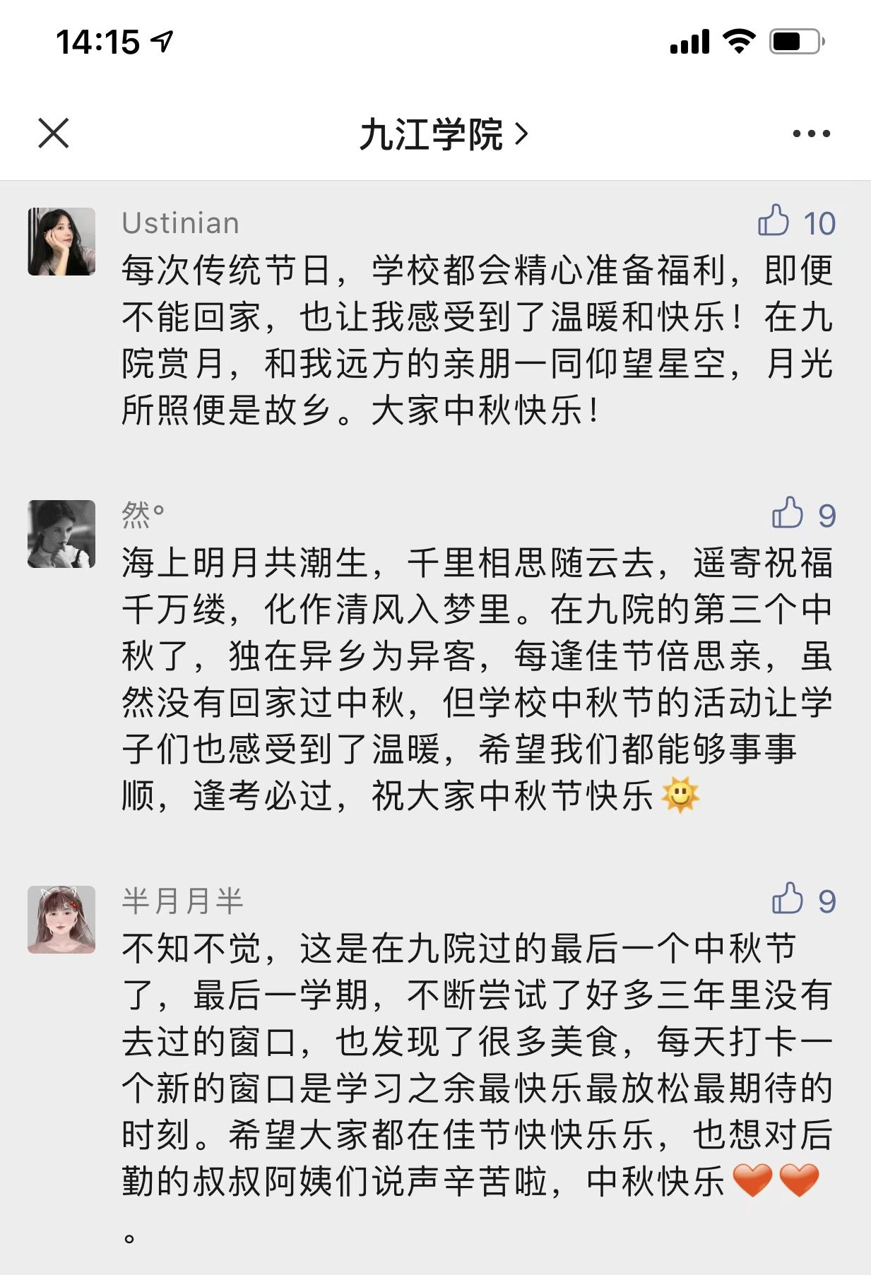 “每次传统节日,学校都会精心准备福利,即便不能回家,也让我感受到了温暖和快乐!”“作为一名大一新生,第一次离家过中秋,看到朋友学校发的月饼还以为我们学校不会发月饼,有点失落,但现在不用担心了,因为我知道,我与九院相遇了,未来四年里,我都会与九院月饼相伴,和九院学子共度佳节,共赏皓月” ……在