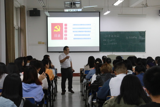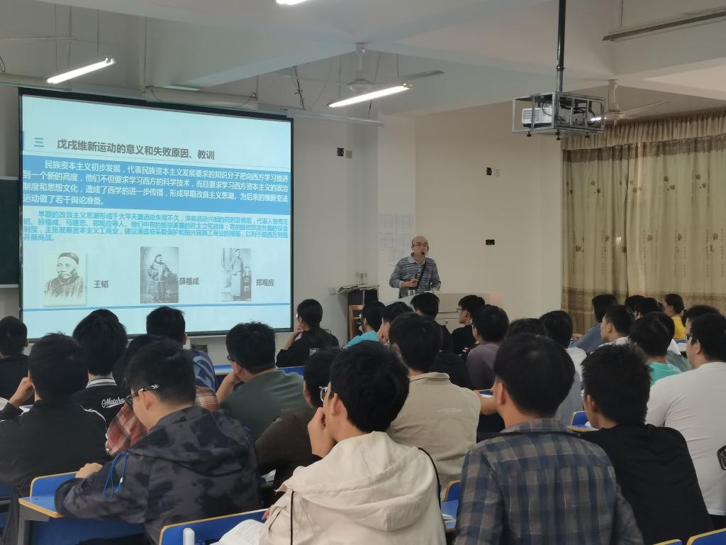 在谢伏华博士主讲的《毛泽东思想和中国特色社会主义理论体系概论》课程中,以学生为主讲的“我来讲新闻”环节作为当天课程内容的开场,教师点评后引入授课主题,重点讲述了社会主义建设道路初步探索的重要理论成果,着重分析了新中国成立初期社会主义建设的历史背景、党对“走自己的道路”的探索历程与重要成果等等内容;在课程《思想道德与法治》中,余志权老师以正反两个案例导入,重点讲述了理想信念是精神之“钙”,引导同学们要坚定理想信念,做有担当、敢作为、有能力的新时代青年;在《中国近现代史纲要》课堂中,姚建平副教授讲授了洋务运动的兴衰,分析了洋务运动的兴起背景、指导思想和主要内容,引导学生正确地认识了洋务运动的客观作用和失败的历史教训;罗小青老师则讲授了戊戌维新运动的意义和失败原因、教训,通过引导学生对形象生动的历史素材的感知,使同学们客观辩证地了解国史、国情,认识社会,树立了正确的人生观和价值观。