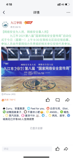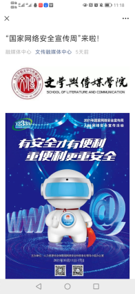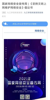 官方微信公众号、官方微博QQ账号在网络安全宣传周期间开展网络安全进校园的宣传活动,组织江西省网络安全知识竞赛、发布防网络诈骗、注意个人网络信息安全等知识,得到广大同学的关注和积极参与;外国语学院学生会微信公众号及微博发布“加强网络安全,防范电信诈骗”推文,全院师生积极转发宣传,并参与江西省网络安全知识竞赛活动;文传学院发布推文宣传“国家网络安全宣传周”;附属医院通过公众号宣网络安全宣传周倡议书、宣教知识等。