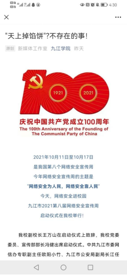 10月11日至10月17日是我国第八个网络安全宣传周。我校对网络安全宣传周活动高度重视,提前策划、安排部署,学校层面积极配合九江市委宣传部、市委网信办做好九江市“第八届国家网络安全宣传周”的启动仪式。我校二级学院分别开展了丰富多彩、形式各异的网络安全教育活动。
