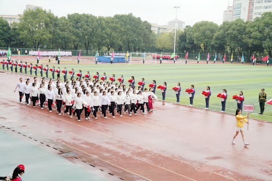 上午8时整,伴随着昂扬振奋运动员进行曲,我校第二十届运动会进场仪式正式开始。国旗、校旗、运动会会旗和会徽在仪仗队护卫下率先入场,他们精神饱满、气宇昂扬,迈着标准的正步依次通过主席台,充分展现了我校莘莘学子积极向上的精神风貌。