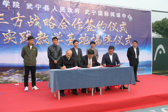 副校长陈春生、武宁县副县长卢恒墀、武宁国际网球中心唐光华共同签署三方战略合作框架协议