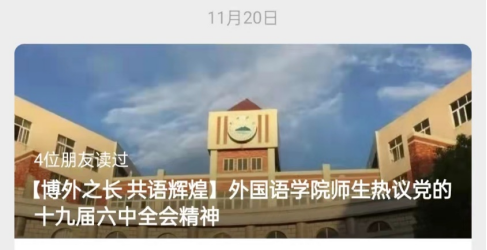 外语学院开展第二课堂红色教育,组织学生周周开展主题团课,月月举办红色宣讲,坚持开展“培养一个高雅爱好,学会两项运动技能,熟读七篇国学经典”为主要内容的“一二七计划”,搭建香远雅集、阳光俱乐部、三立国学社三大平台,打造香远文化节、国学微课堂、师生微运会三大品牌,如“风揽国学六艺,墨舞中外千秋”故事会、“传国学经典,融英语文化,做国韵少年”脱口秀等;开展党的十九届六中全会精神网上热议活动。经济学院等学院开展主题党日观影活动,利用“电影课堂”引导师生学习百年党史,忆峥嵘岁月。临床医学院举行辅导员“微党课”授课比赛,举办“学党史,悟思想,办实事,开新局”观影活动。电子商务学院官方微信公众号设立“青春心向党 党史百年天天读”专栏,讲述百年党史中同日期发生的重要事件和故事。医学院组织学生积极参与“请党放心,强国有我”党史知识网络答题活动, 积极观看“同上一堂党史课”“榜样的力量”网络视频。
