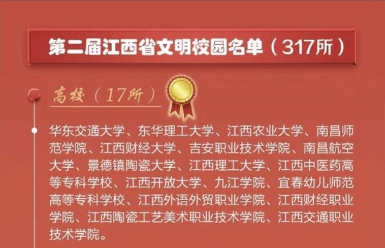 12月22日,全省精神文明建设表彰大会在南昌召开,会议隆重表彰了第七届江西省道德模范和省文明城市、省文明村镇,第十六届省文明单位以及第二届省文明校园、省文明家庭,我校获评为第二届江西省文明校园。