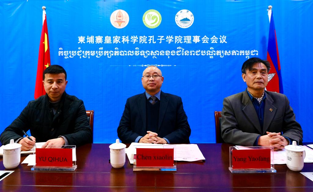 1月5日下午,柬埔寨皇家科学院孔子学院2021年理事会会议通过视频会议举行。校长陈小林,副校长杨耀防,柬埔寨皇家科学院院长Sok Touch(宋独)、秘书长Yang Peou(杨博)等参加了会议。会议由杨耀防主持。