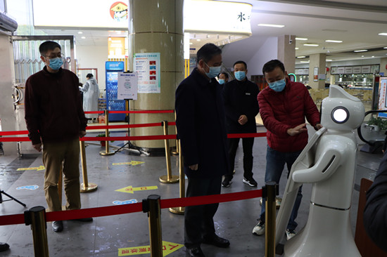 在学生三食堂,赵伟仔细询问了入口测温机器人的性能及测温速度等,要求有关部门要做好校内物资储备工作,切实保障好学生学习生活。