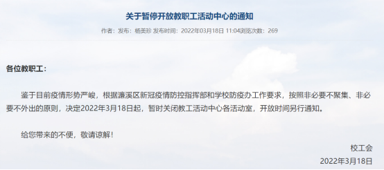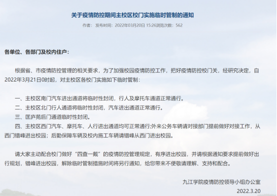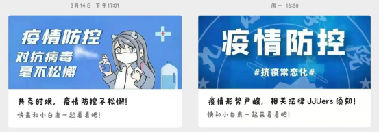 为做好防疫宣传工作,普及防疫科学知识,提升防控意识,让学院师生们以更加积极的心态应对疫情,校疫情防控领导小组办公室、学生处、校工会等部门分别发布了《关于疫情防控期间主校区校门实施临时管制的通知》、《致全体 学子的疫情防控倡议书》、《关于暂停开放教职工活动中心的通知》等。