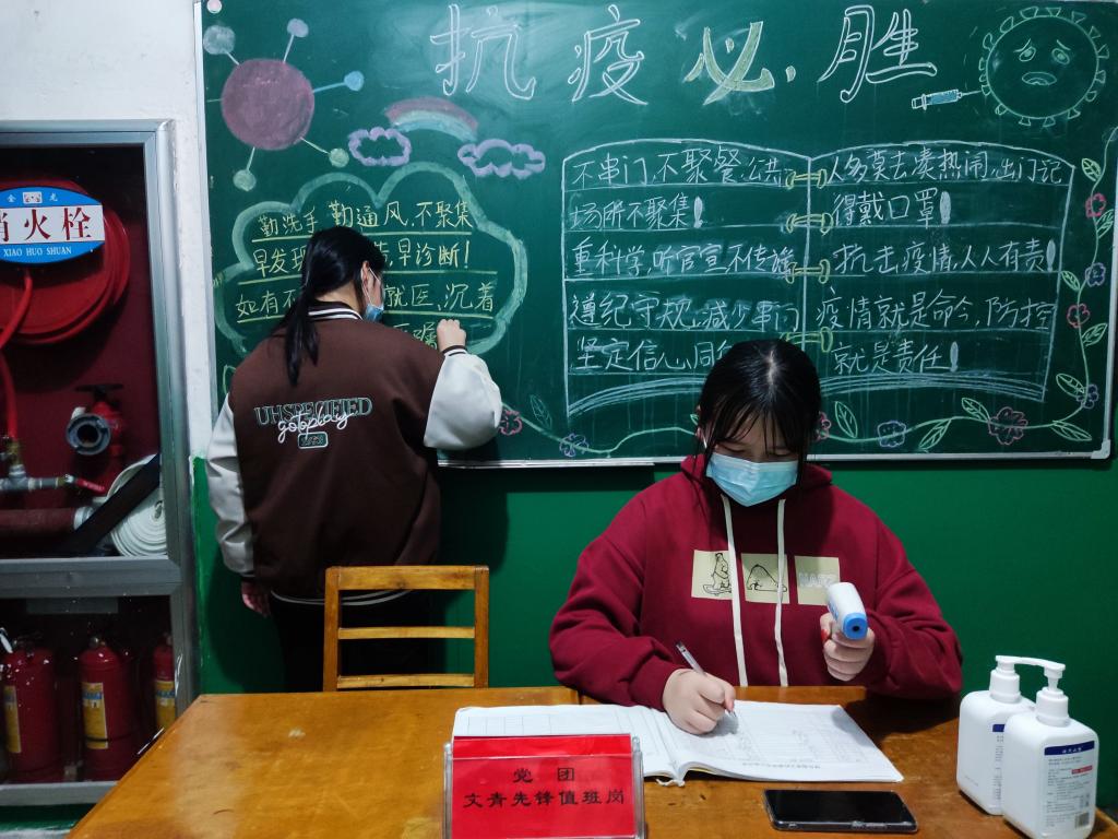 这些志愿者有的在核酸检测现场,坚持辅助医护人员维持秩序,组织师生有条不紊地进行核酸检测;有的伫立在宿舍楼下,为进宿舍的同学们测量体温,督促大家戴口罩,进行消杀,并对其他人员出入宿舍的情况进行登记。