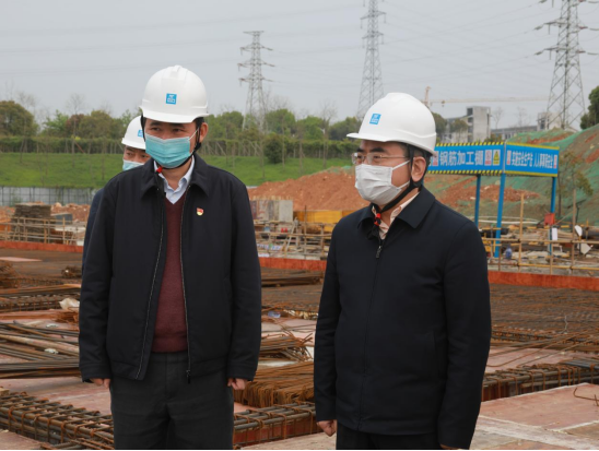 在施工现场,赵伟向蒋文定介绍了综合体育馆项目设计、施工进展等项目建设情况。