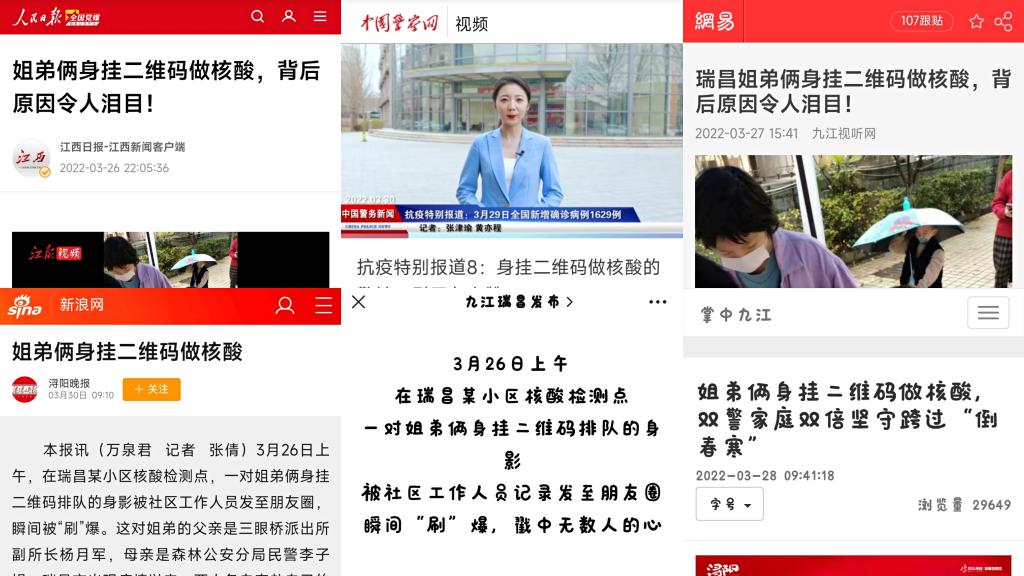 这对姐弟的爸妈都是瑞昌市公安局民警,瑞昌市出现疫情以来,两人各自奔赴自己的岗位,因为夫妻俩都是外地人,长辈均不在身边。家里无人照顾这对姐弟,便出现了开始这一幕。随后,江西日报、网易、九江视听网等媒体报道分别以《姐弟俩身挂二维码做核酸,双警家庭双倍坚守跨过“倒春寒”》《最美战疫人|瑞昌挂二维码做核酸的姐弟俩刷屏了,背后原因让人泪目》等为题,将这段记录进行报道和转载,引网友们纷纷点赞。近日,这对“网红”姐弟的警察爸妈被证实都是
