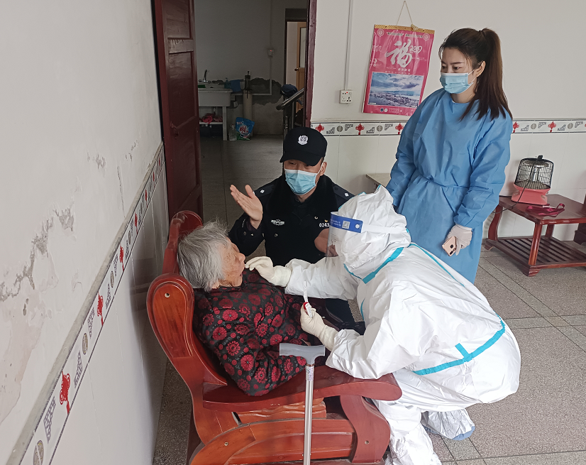 带医护人员给行动不便的老人上门做核酸检测