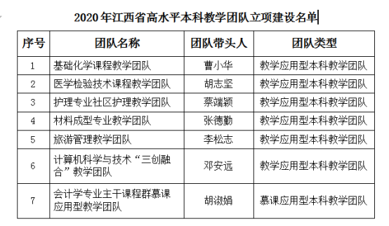 2020年我省发布《江西省高水平本科教学团队建设方案》,“十四五”期间,计划分两批遴选360个左右省级高水平教学团队并支持建设。根据《关于公布2020年江西省高水平本科教学团队建设名单的通知》(赣教高字﹝2021﹞20号),我校“基础化学课程教学团队”等7个教学团队获批2020年江西省高水平本科教学团队建设点,获批率位居全省前列。