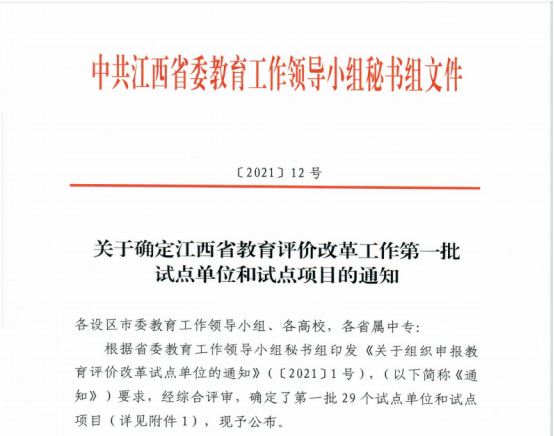 为深入推动新时代教育评价改革各项任务在我省落实落地,2021年江西省启动了教育评价改革试点工作,我校积极响应,报送的《教师教育教学实绩评价改革试点实施方案》项目,经专家评审,最终入选试点项目,学校获批省教育评价改革工作第一批试点单位。