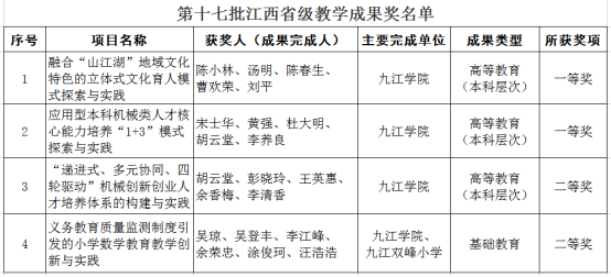 根据江西省教育厅《关于公布第十七批江西省级教学成果奖评选结果的通知》(赣教师字〔2021〕28号),我校共有4个项目喜获第十七批江西省级教学成果奖,其中一等奖2项。
