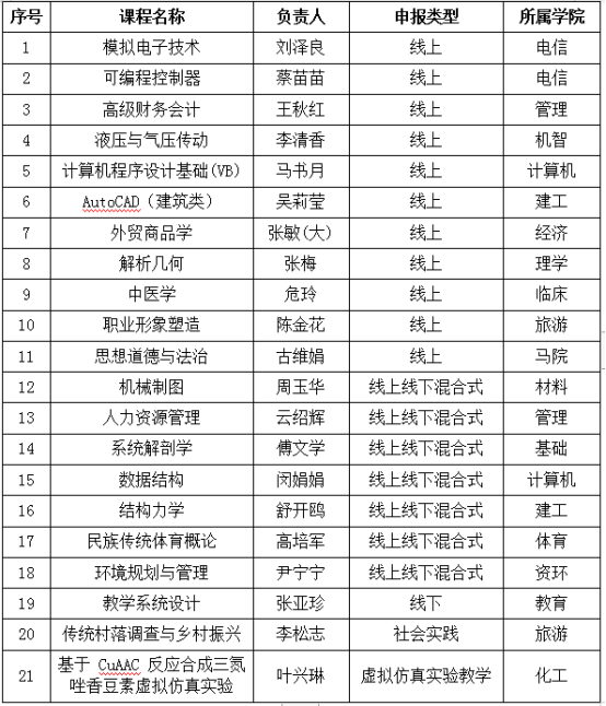 根据《关于公布2021年江西省线上、线下、线上线下混合式、社会实践一流本科课程认定结果的通知》(赣教高字〔2022〕3号)和《关于公布2021年江西省虚拟仿真实验教学一流本科课程认定结果的通知》(赣教高字〔2022〕5号),2021年,我校共有21门课程通过江西省一流本科课程认定,其中线上课程11门、线上线下混合式课程7门、线下课程1门、社会实践课程1门、虚拟仿真课程1门。