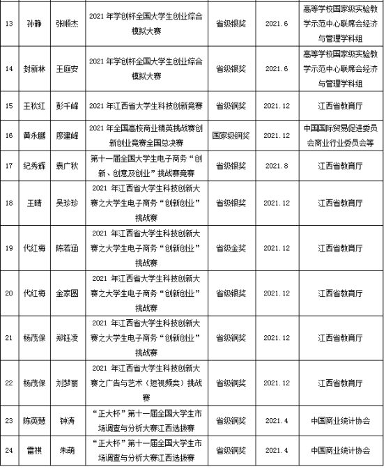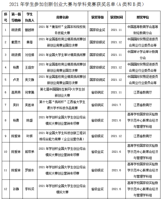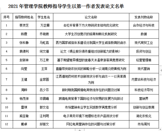 管理学院以卓越会计师班人才培养改革为先导,实施本科生导师制、校外导师制、分学期实习调研、专业创新创业引导、参与教师科研课题、推进技能竞赛与职业资质获取等举措。2021年,管理学院学生获得A类和B类学科竞赛省级及以上奖项24项,会计学专业学生连续五年进入全国税务技能比赛全国总决赛,并均获得全国一等奖;2021年,一带一路暨金砖国家技能发展与技术创新大赛之智能会计大赛全国赛中,由该院审计学专业学生组成的两支队伍分别获得第一名和第四名,并双双获得全国一等奖。2021年,在校学生以第一作者发表论文12篇;主持国家级、省能大学生创新创业训练项目6项。