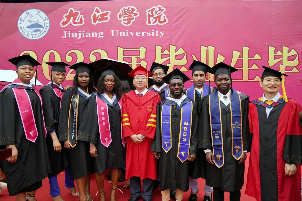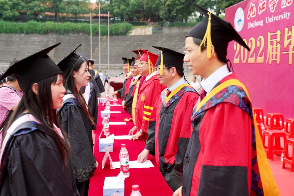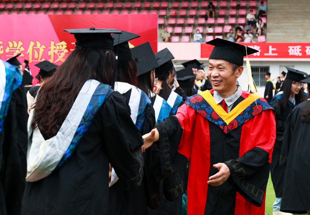 毕业典礼在2022届全体毕业生们欢呼声中结束,赵伟、陈小林等校领导、校学位评定委员会委员冒雨来到同学们中间,与他们合影、握手、话别。