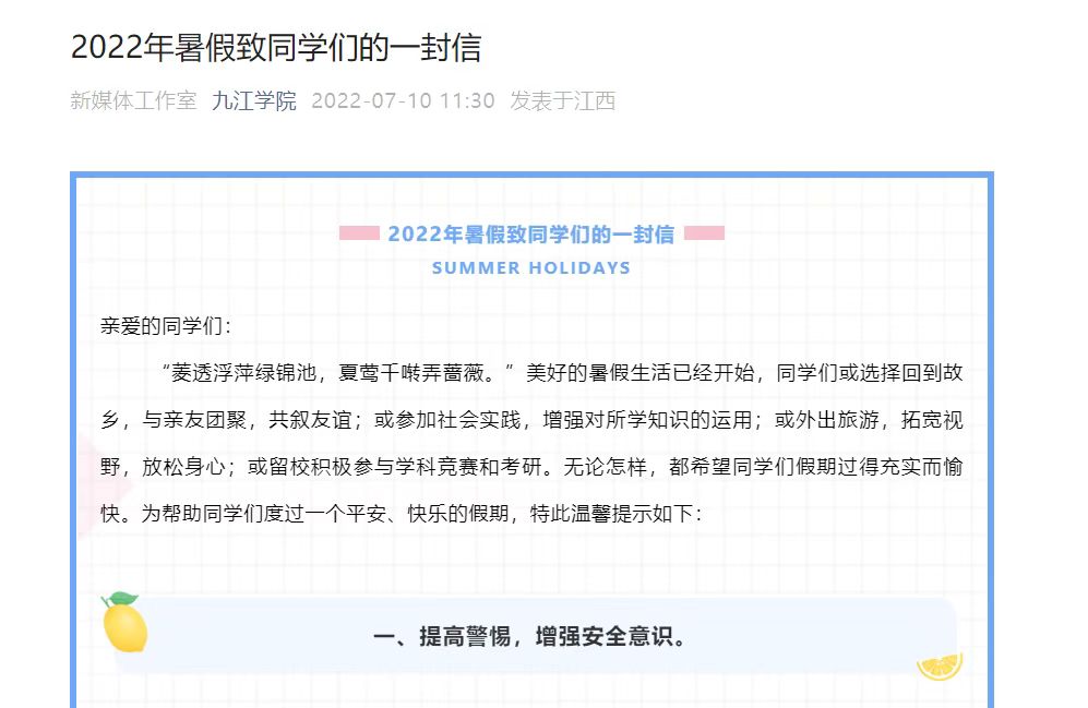 暑期,青少年溺水事故进入多发、频发期,为贯彻落实省委书记易炼红专题调度部署严防学生溺水工作会指示精神,结合学校工作实际,学校党委宣传部在校园网、新媒体公众号上及时进行了防溺水安全教育宣传;保卫处在学校各水域设置警示牌,并配备了相应的救生物品。此外,为帮助同学们度过一个平安、快乐的假期,学生处发布了《2022年暑假致同学们的一封信》,温馨提示同学们要增强安全意识,做好疫情防控,科学安排假期生活。