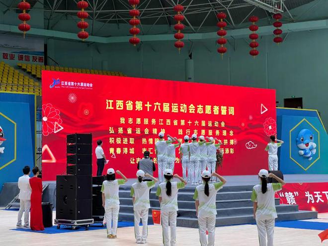 、九江职业大学、九江职业技术学院、江西财经职业学院的志愿者服务队接受了市委常委,宣传部部长孙金淼授旗。大学生志愿者们高举右手,声音洪亮,发出铿锵有力、斗志昂扬的青春誓言——“我志愿服务江西省第十六届运动会,弘扬省运会精神,践行志愿服务理念,积极进取,热情服务,团结协作,奋力拼搏,青春浔城,志汇省运,为九江争光,为省运添彩,让志愿者的微笑成为九江最好的名片。”