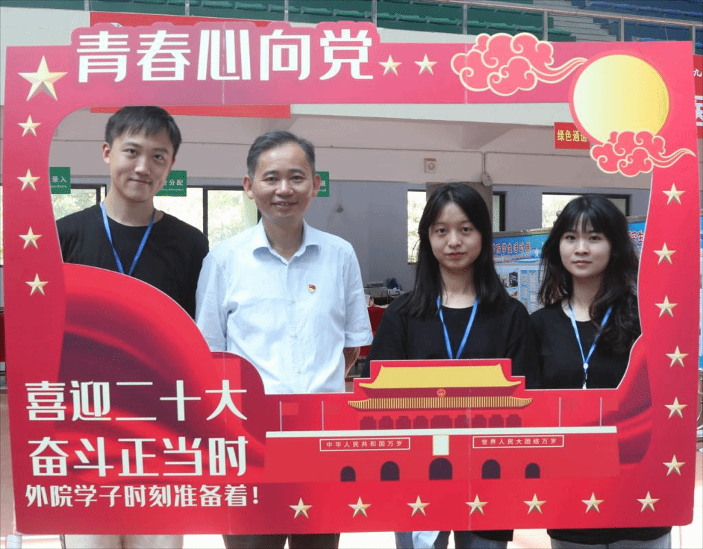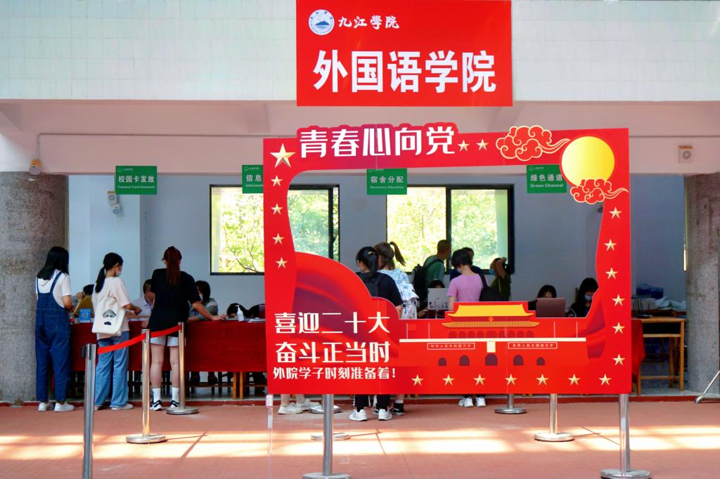 在党的二十大来临之际,为更好地传承红色基因、赓续红色血脉,外国语学院、护理学院用心安排布置了“青春心向党”合影镂空墙,将党史学习打造成一份“开学见面礼”,让新同学们与红色教育“一见倾心”,充实了校园生活。此外,“我与外院的初次相遇”录取通知书合影展板格外醒目,惹人注意,营造了浓厚的迎新氛围。