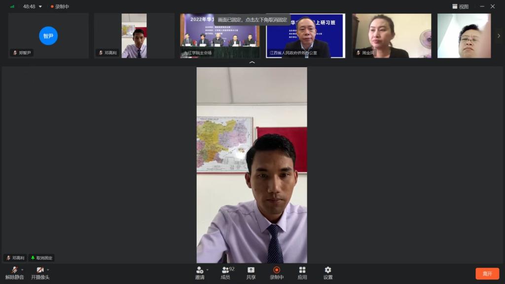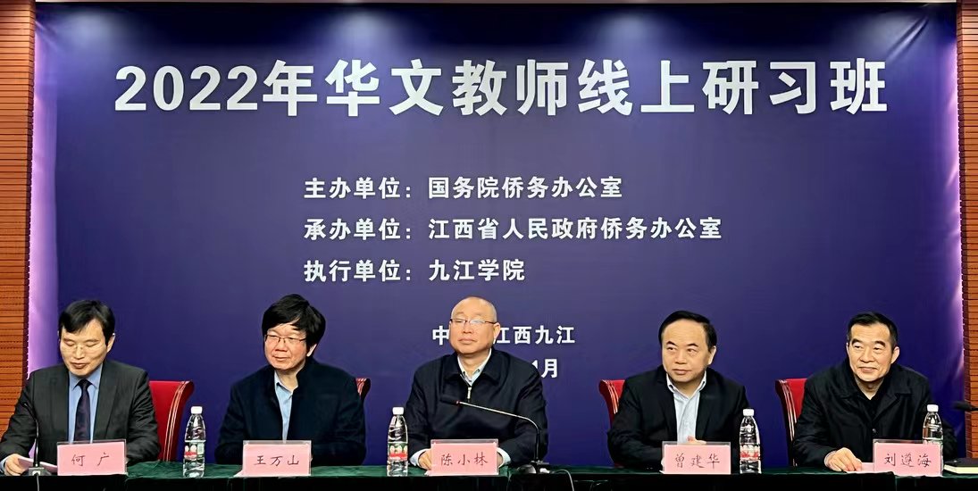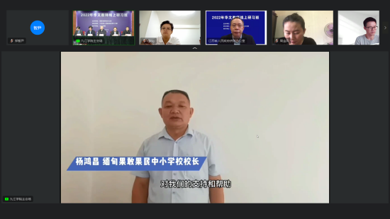 11月15日,由国务院侨办主办、江西省政府侨办承办、 协办的“2022年华文教师线上研习班江西九江班”开班,来自缅甸、泰国、柬埔寨、马来西亚等国家的华文学校教师100余人在线参加研习。15日上午,开班仪式在我校逸夫图书馆报告厅举行。省政府侨办主任张继钦、市政府侨办主任曾建华,我校校长陈小林、副校长王万山和党委委员、统战部部长刘遵海以及100多名海外华文教师相聚云端,参加开班仪式。