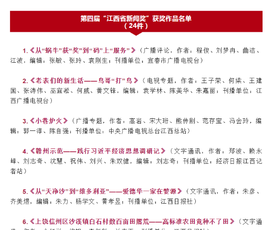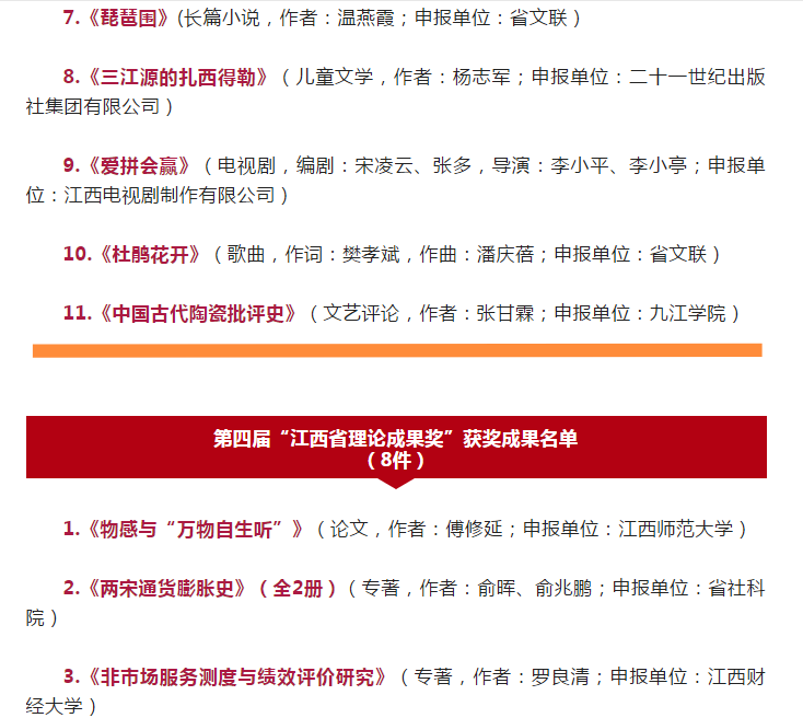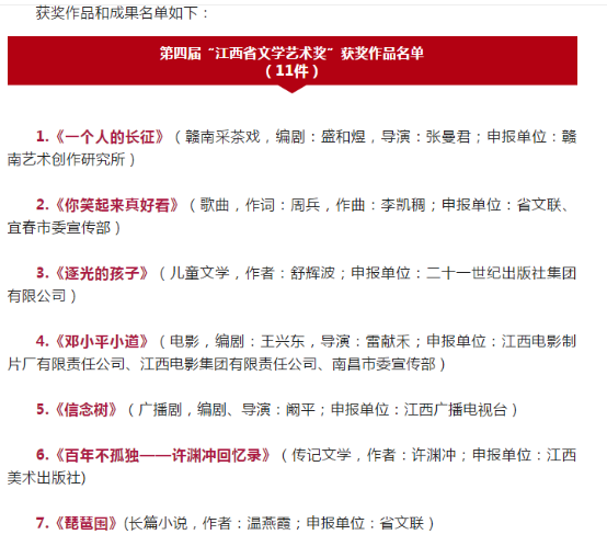 据悉,本届获奖作品和成果共43件,其中11件作品获第四届“江西省文学艺术奖”、 8件成果获第四届“江西省理论成果奖”、 24件作品获第四届“江西省新闻奖”。