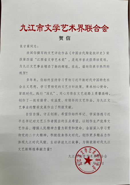 近日,中共江西省委、江西省人民政府下发《关于第四届“江西省文学艺术奖”“江西省理论成果奖”“江西省新闻奖”获奖情况的通报》(赣委〔2022〕329号),艺术学院张甘霖作品《中国古代陶瓷批评史》从众多作品中脱颖而出,被授予第四届“江西省文学艺术奖”。这也是九江市文学艺术界首次获得该奖项。