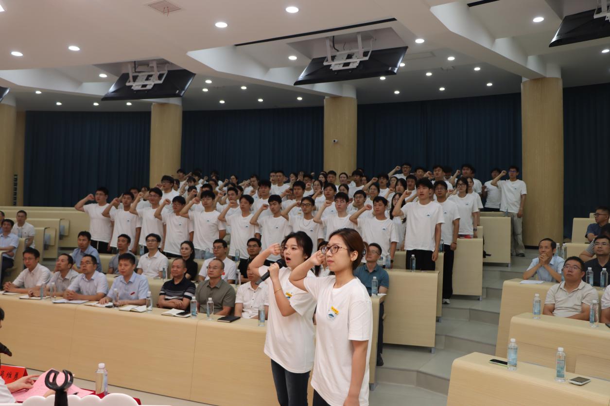 致辞结束后,校领导与发展规划与研究生处负责人为新生代表佩戴校牌。全体研究生起立,庄严宣誓,承诺恪守“竞知向学、厚德笃行”的校训,潜心钻研、勇担使命,以青春与智慧践行新时代