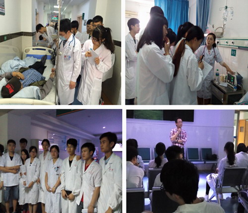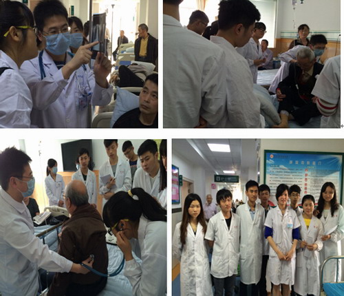 5月20日下午,农村定向班医学生来到附属医院住院部消化内科见习,分为三组,分别由施彦卿,刘中颖和雷霞三位老师带教,在三位老师的细心指导下,见习了消化道出血及肝硬化等常见疾病,学习病史询问技巧,出血量的估算,输血补液的指征,如何检查黄疸、腹水及肝掌、蜘蛛痣等临床表现。三位老师临床经验都很丰富,讲解耐心详细,同学们很敬佩,希望与老师讨论学习心得。最后蔡长春主任做了总结,蔡主任刚从美国留学归来,思维活跃,见解独到,指出消化系统疾病未来发展方向是内镜和微创。