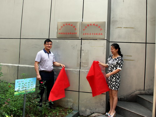 政法学院大学生实习实践基地”、“九江学向阳闸社区法律分诊所”及“向阳闸社区妇女儿童维权之家”进行揭牌。揭牌仪式后,全体人员参观了向阳闸社区居民服务中心并举行了三方座谈,并就具体的合作事宜及下一步的合作项目等内容作了详细沟通交流。
