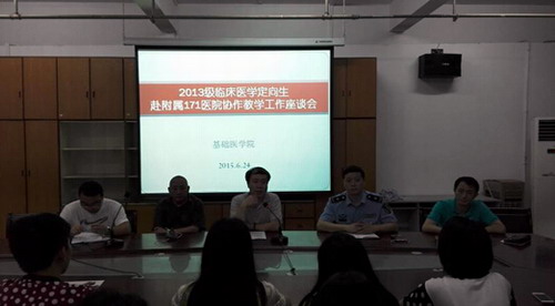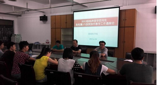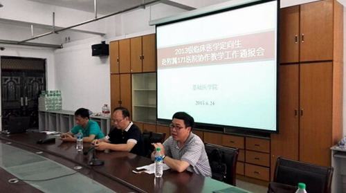 6月24日晚,根据学校决定在附属171医院安排临床医学协作教学的精神,基础医学院召开了2013级临床医学定向生赴附属171医院协作教学工作通报会和全体学生座谈会。基础医学院院长车向新、党委书记余朝阳参加座谈会。