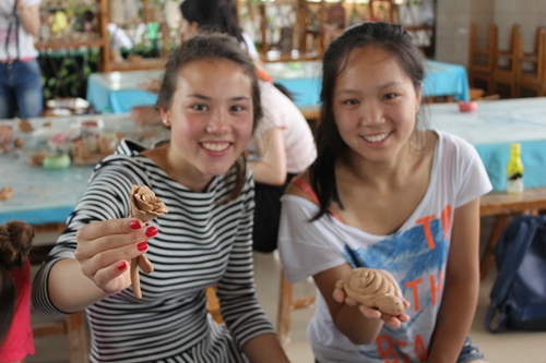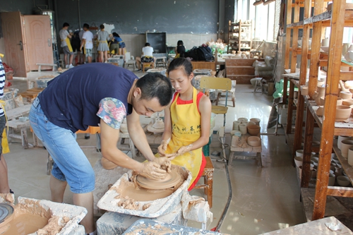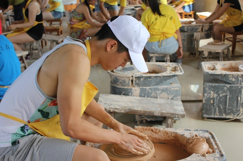 陶艺体验当然也是学习陶瓷文化必不可少的环节。27日,大家来到陶瓷体验区,在观看陶瓷大师制瓷时,营员们都纷纷表示道:“这是一个简单的活,只是捏一捏,拉一拉就行了”。但是当来到体验区,大家坐到坯土面前都显得手足无措。营员们分成两组,认真听老师讲解的同时,自己也开始动手做,毕竟是第一次,大家都略显生疏,有些营员还会把泥土溅出来,可是时间久了,部分同学掌握了诀窍,在老师的帮助下,做出来的碗盘、碟子等等,还有模有样。但是也有些同学做的样子不太好看,略有失望同时也不舍不弃。营员们还进行了捏土、画坯的体验,有些同学捏出了很多卡通人物和动物,有些同学在盘子上画出各种各样的花型和玩偶。在短暂的时间里,大家积极参与,最后离开时,还带着恋恋不舍的心情,表示下次有机会过来,还要体验一把。