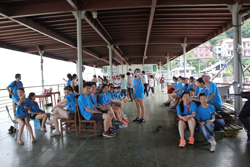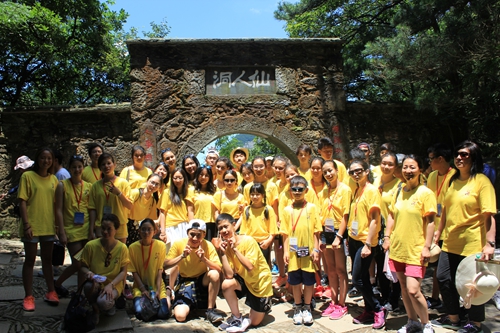 7月26日上午,营员们沿路往赣东北而去,来到位于江西九江湖口县鄱阳湖出口处的石钟山,此山不高,海拔只有61.8米,营员们带着愉快的心情向上爬着。听说此山因山石多隙,水石相搏,能击出如钟鸣之声,营员们便都来到大石面前,敲击着石头。鄱湖人余亚飞诗称:“鄱湖接近长江处,二水相交奇景生,澈夜浑流互排斥,浊清界限见分明”。随之大家坐上小艇看石钟山,感受风景雄奇秀丽,也亲眼所见水线分明,江水浑浊,湖水碧清的神奇。