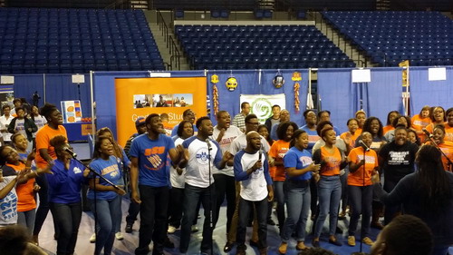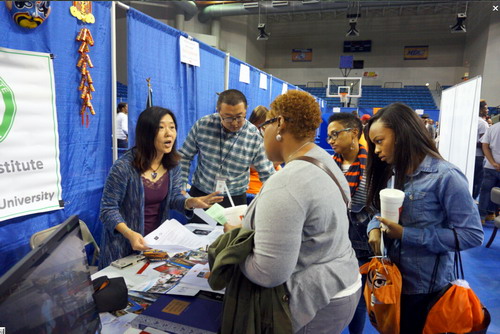 萨凡纳州立大学每年会在春、秋两季举办“校园开放日”活动,邀请全美的高中生和家长们来参观大学校园,并通过展台的方式让来参观的学生和家长与各个院系和服务部门的老师沟通交流。我校与萨凡纳州立大学合办的孔子学院是萨凡纳州立大学重要的国际交流项目,在此次校园开放日活动中,孔子学院的展台吸引了大批的美国高中生和家长来咨询。孔子学院的几位老师通过图片、视频、PPT等多种方式详细介绍了萨凡纳州立大学孔子学院和 的情况,同时展示了萨凡纳州立大学孔子学院举办过的社区文化活动、汉语教学课程设置、教材、HSK考试和奖学金等项目。