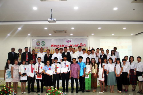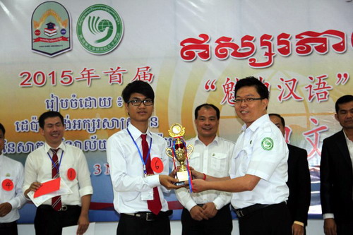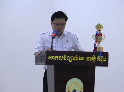 谢莫尼勒院长在讲话中指出,孔子学院和亚欧大学合作设立的中文系近年来取得了较好成绩,培养了高水平懂中文的专业人才,随着中国政府“一带一路”项目的逐步实施,柬埔寨中文专业人才的需求量将会越来越大。他鼓励在座的学生要努力学好中文,抓住机遇,提升自我,争取”Learn Chinese, double salary.” 。谢莫尼勒院长表示,很高兴看到学生们正常的发挥,感谢孔子学院教师们的辛勤付出,目前在整个柬埔寨,中文已成为了相当重要的语言,而亚欧大学中文系正源源不断地将一批批富有学识的学子插上了中文的翅膀,他们将飞得更高更远。