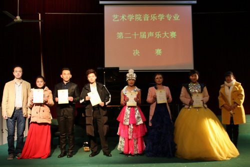 经过激烈的角逐,白航、任彦铭荣获独唱一等奖;王洪玲等同学带来的合唱曲目《直尕思得》荣获小组唱一等奖。周鲜花、马程磊、李鹏、王洪玲荣获独唱二等奖;邓颖婷、孙彦山、桃兆年、周容、俞小松、任高扬获得独唱三等奖;陈润泽、邵振伦、赵婉清、王娟、任娟、安贝贝、张雨媂、陈雪、窦宇森、吕淑君、陶湘、杨盼获得独唱优秀奖,学院领导和教研室、学生科负责人分别为获奖者一一颁奖并合影留念。