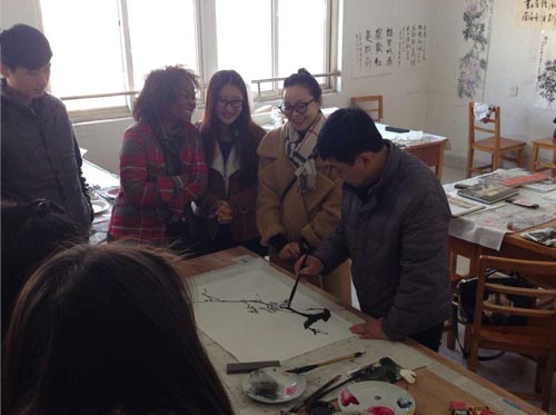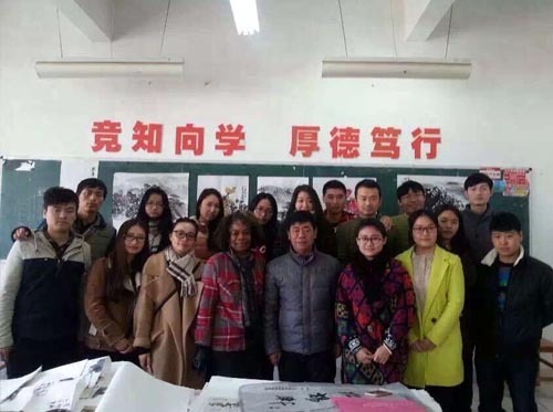 11月27日,美国萨凡纳州立大学孔子学院Peggy教授来到艺术学院2012级绘画专业的中国画教室,听取了余晓庭老师的中国画写意花鸟与山水课程。艺术学院教学科研科科长汤艳翻译。