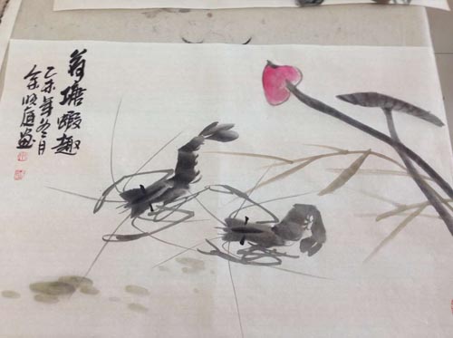 余晓庭老师在课堂中首先给大家示范了水墨画虾,他讲到水墨画虾最有艺术效果,但笔间水份要稍充足些,才能使画出来的虾有新鲜透明感。水份的适量控制是相当重要的。如虾拟画少数几只,也可适当加些补景,如水生植物的睡莲、浮萍、水草等,采用设色或水墨,一幅以虾为主的画面上不宜用色太艳。