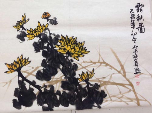 随后示范了写意牡丹,牡丹花大富丽、鲜洁大方,是历代诗人画家经常描写的重要题材,称它为“国色天香”。在讲授牡丹花画法时,分别讲了花头、叶、花心、叶茎的画法,整幅画面用笔苍劲有力,画出木质感来。