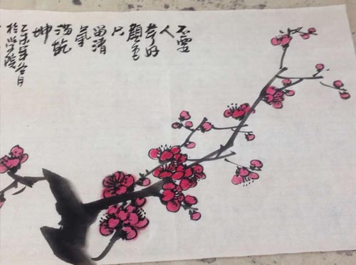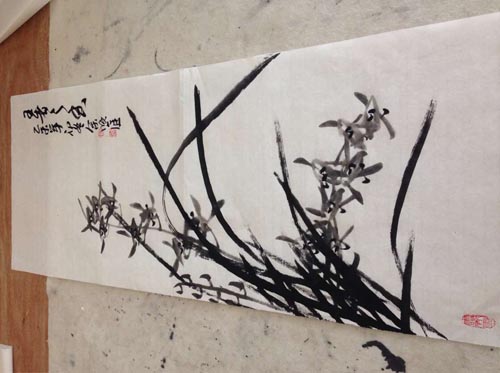 最后呈现在大家面前分别是“梅”、“兰”、“竹”、“菊”,梅兰竹菊称四君子,是传统学习中国花鸟画的绘画题材。余老师谈到,梅兰竹菊练好后,掌握了运笔用墨的基本绘画技法,在此基础上,可举一反三再拓学其它绘画题材就容易些。例如,画梅花表现的手法丰富,基本画法为勾勒法和没骨法。历代文人墨客写画立志,借书画言其志,寄笔墨抒其情,抒发自己的抱负,历来是画家喜于表现的题材。有着纯洁高雅形象的兰花深受中国文人的倾慕,有“王者香”之称的馥郁清芬,也是画家书写描绘的题材。画竹要注意各根竹和竹节处,不要在一条水平线上。画竹竿时应有笔墨变化,通过竹竿的粗细,用墨的浓淡干湿等来营造出虚实关系和空间感。菊花在国画题材中出现较晚,如清代画家石涛、吴昌硕、近代画家齐白石等。当代也有不少画家以菊花为题材,赞美菊花傲雪迎霜的品格。